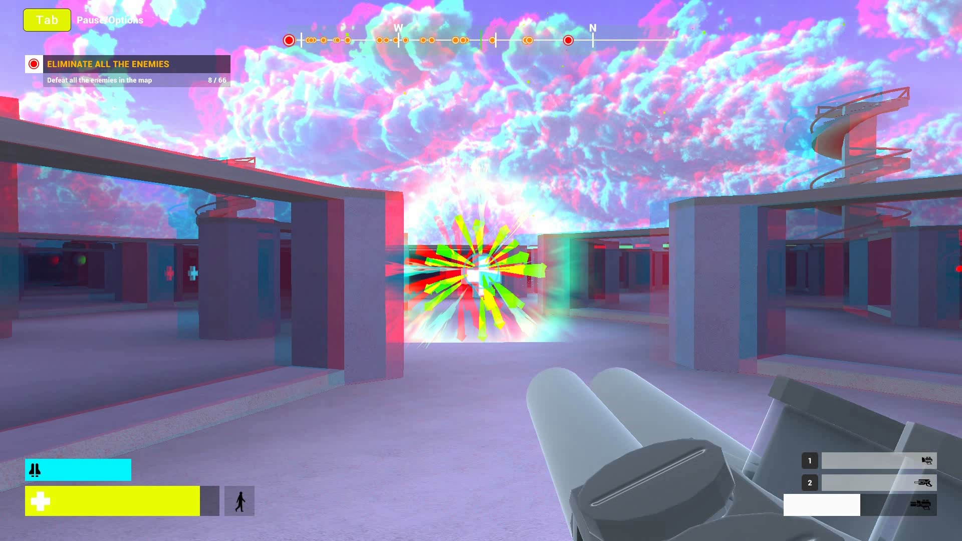 Eliminiere in einem hexagonalen Labyrinth 66 fliegende Drohnen. Mit 6 Levels gibt es verschiedene Schwierigkeitsstufen in Geschwindigkeit. 3 verschiedene Waffen und ein Flying-Pack stehen dir zur Verteidigung zu Verfügung.